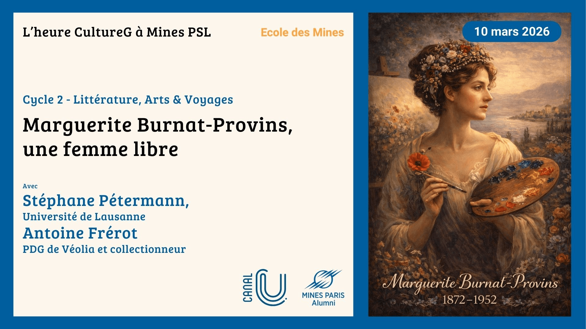 Mines Paris Alumni et Mines Paris - PSL, en partenariat avec Canal-U (la WebTV des universités), s'associent pour créer un moment régulier de diffusion de la connaissance et de convivialité, via des conférences grand public de culture générale, à l'instar de ce qui existe déjà sur www.cultureGnum.fr (120 vidéos FMSH / Canal-U, depuis 2016). Un premier cycle a été Littérature, lors du premier quadrimestre septembre-décembre. Un deuxième cycle janvier-juin 2026 s'intitule Littérature, Art & Voyages.