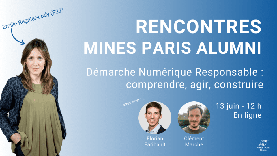 La première édition des Rencontres Mines Paris Alumni est consacrée au Numérique responsable et animée par Emilie Régnier-Lody, diplômée du Mastère Spécialisé Exécutif Management Global RSE et Développement Durable (RSE-DD) de la promotion 2022, aux côtés de Florian Faribault et de Clément Marche.
