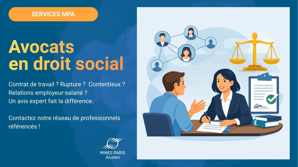 Mines Paris Alumni élargit ses services en référençant des avocats spécialisés en droit social, identifiés au sein et autour du réseau. Que vous soyez salarié ou employeur, que ce soit pour une question de contrat de travail, de rupture, de contentieux ou de relations employeur-salarié, nous avons l'habitude de travailler avec ces professionnels avec qui nous vous connecterons directement en cas de besoin.