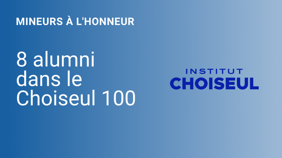 ...Institut Choiseul publie chaque année un classement des 100 leaders économiques de demain. Parmi les alumni de ce classement : Emmanuel Macron, Florence Verzelen, ...Cette année huit diplômés de Mines Paris ont été récompensés : Pierre-Louis Dubourdeau, Geoffrey Bouquot, Guirec Le Lous, Adeline Guérard, Matthieu Landon, Thomas Métivier, Eléonore Crespo et Thibaud Frossard.Découvrir leurs portraits ci-dessous... 👇